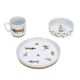 Das Set aus Porzellan umfasst einen Teller, eine Schüssel und eine Tasse.